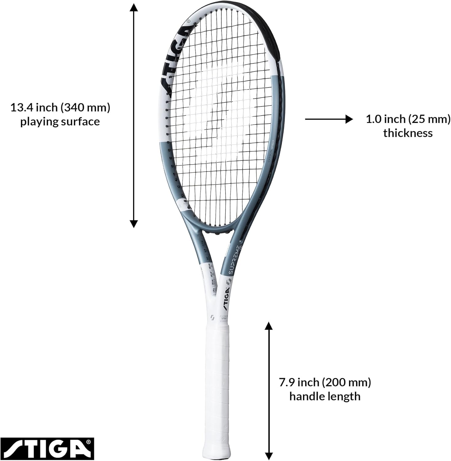- LIGHTWEIGHT FULL-LENGTH RACKET: The STIGA Supreme LW tennis racket is super-easy to maneuver, with a lower weight that is most suitable for women or juniors who want to play with a full-length racket without compromising on control or accuracy. The lighter weight ensures more comfort in play and less strain on your body. Weight (unstrung): 270 g (+/-7 g).