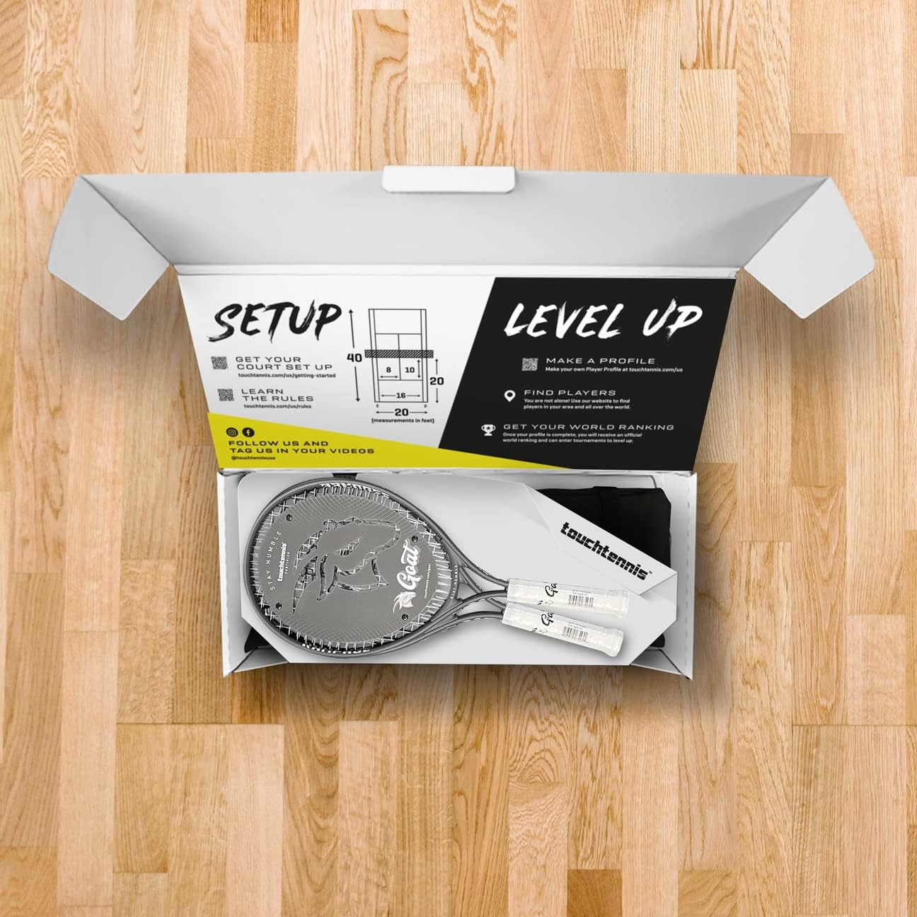 - 2 Official touchtennis Racquets by the GOAT Sports brand. These racquets have adult features like long 7 inch handles, high performance grips as found on top quality racquets, quality strings at 40 lbs tension. These are adult 21 inch racquets to help you hit your hero shots more often!